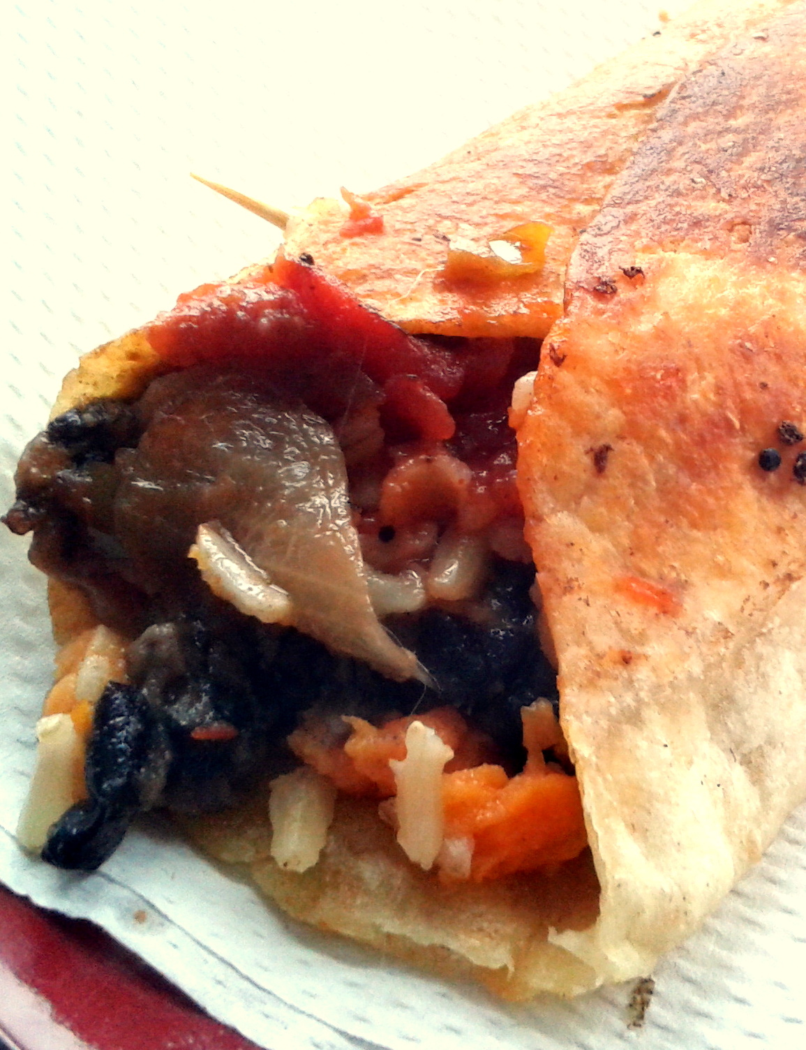 Cranberry salsa, dried fruit, previously mentioned sweet potato or carmilized onions. Hot peppers. This is where you make the burrito yours. Smoked peppers or grilled pineapple, slices of mango? Go drastic, and really break up the flavours.